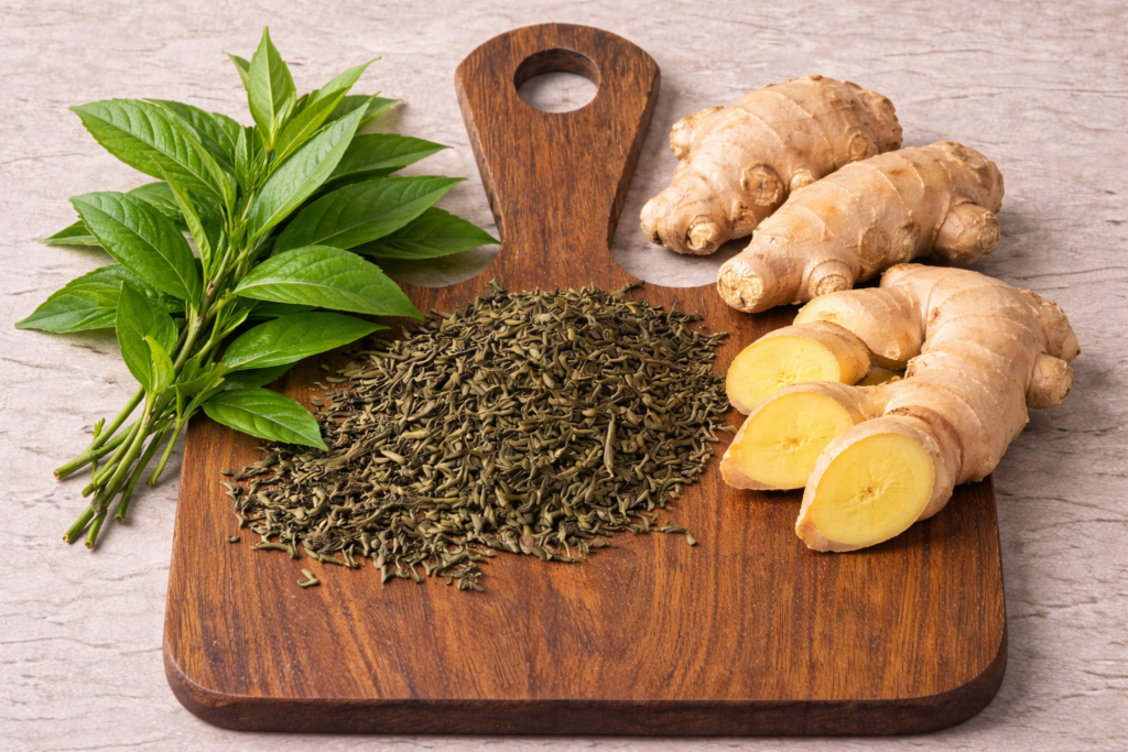 O Chá Verde com Gengibre combina as qualidades revigorantes do chá verde, feito a partir das folhas da Camellia