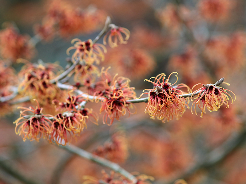 A Hamamélis é uma planta arbustiva perene conhecida por suas folhas distintas e flores amarelo-pálidas que florescem no