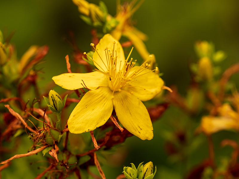 A Erva de São João é uma planta herbácea perene, conhecida por suas flores amarelas brilhantes que parecem estar